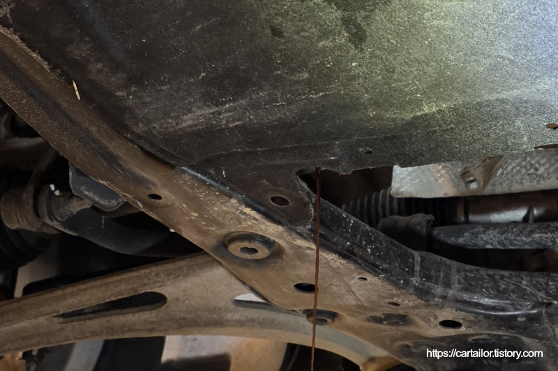 교체 이력이 없는 드레인플러그 와셔를 신품으로 교체합니다. 배출이 완전히 끝났으면 와셔를 교체한 드레인플러그를 손으로 돌려준 후, 규정 토크로 체결합니다.