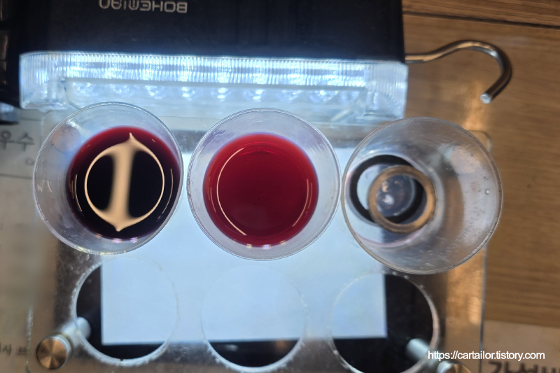 좌측부터 기존 사용유, 레벨링 시 배출된 미션오일입니다. 우측이 현재 차량의 미션오일 상태로 보시면 되겠습니다.