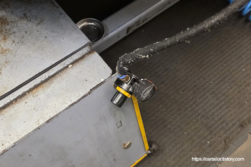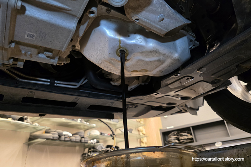 자연 낙하 방식의 엔진오일 배출이 끝났으면 배출구 형상에 맞게 차를 기울인 뒤, 입으로 부는 세기로 에어를 세팅해 잔유를 배출합니다.