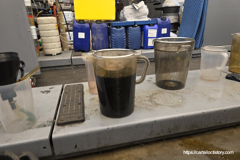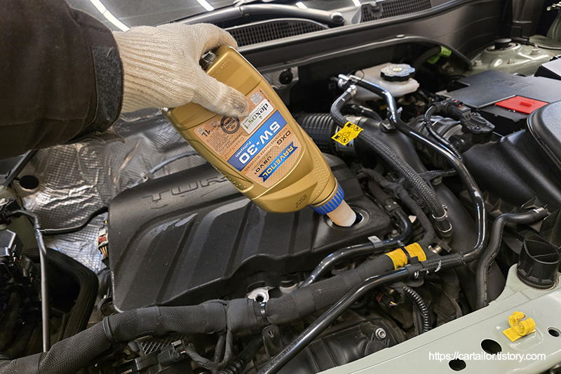 배출된 엔진오일과 메뉴얼에 명시된 용량을 토대로 신유를 주입 후, 시동을 걸어 오일 순환 그리고 온도를 올리는 시간을 갖습니다.
