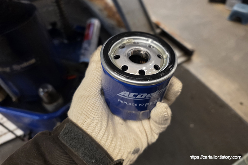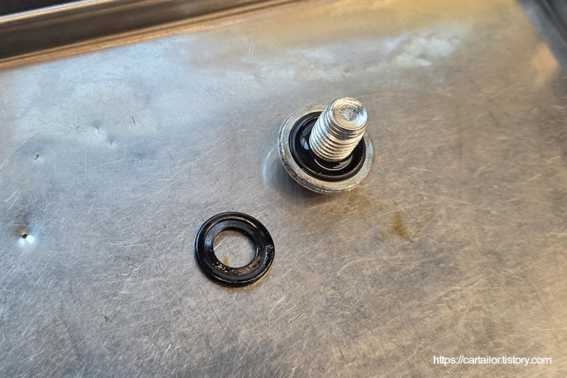 신품 오일필터 오링에 신유를 발라 준비합니다. 드레인플러그 씰링도 신품으로 교체 후, 신유를 발라 둡니다.