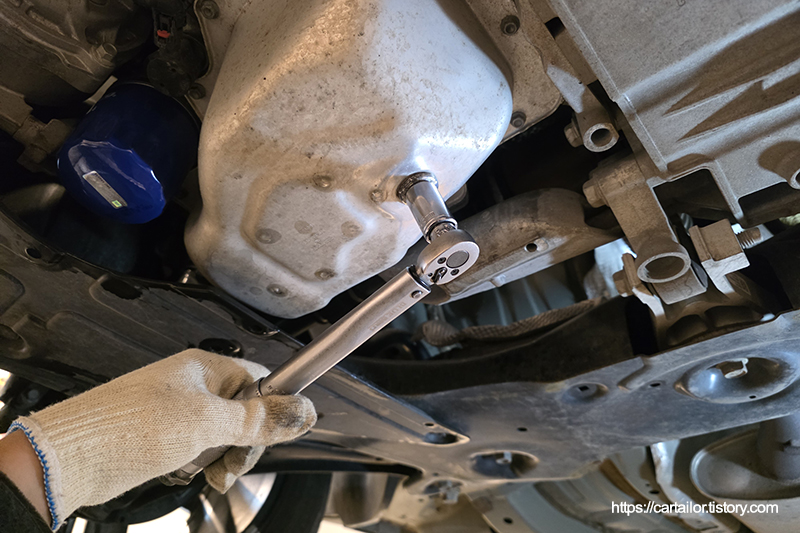 오일 배출이 완전히 끝났으면 오일필터와 드레인플러그를 손으로 돌려준 뒤, 토크렌치를 이용해 규정 토크로 체결합니다.
