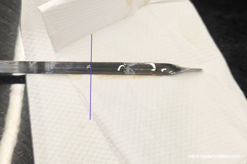 시동을 끄고 수분 후, 딥스틱을 뽑아 오일 상태를 체크합니다. 육안상 보이는 오일 상태는 양호하며, 오일량은 기준치 내 위치해있습니다.