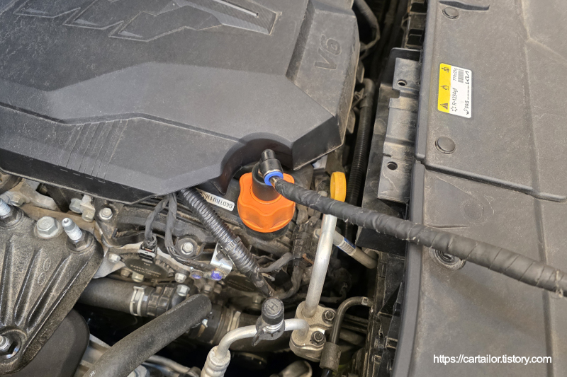 계산된 용량의 신유를 주입 후, 시동을 걸어 오일 순환 그리고 온도를 올리는 시간을 갖습니다.