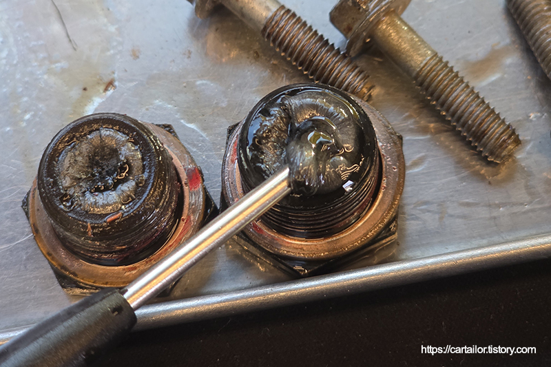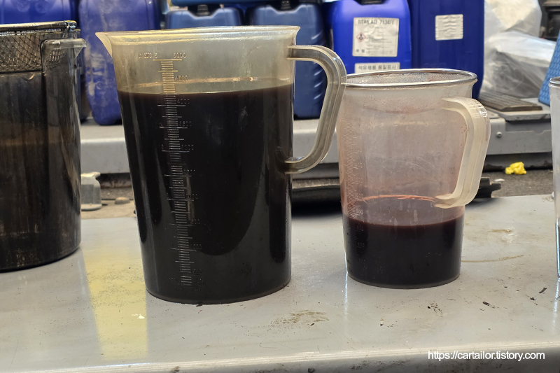 좌측은 기존 미션오일, 우측은 레벨링 시 배출된 미션오일입니다. 우측이 현재 차량의 미션오일 상태로 보시면 되겠습니다.
