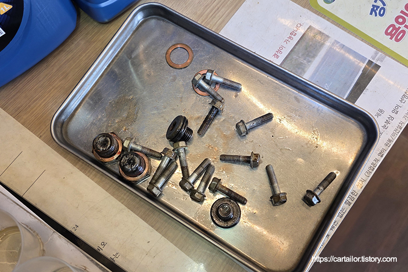 오일팬을 장착한 뒤, 신품 고정 볼트를 손으로 돌려 가고정합니다. 오일팬 위치 조정이 끝났으면 모든 규정 볼트들을 토크렌치를 이용해 규정 토크로 체결합니다.