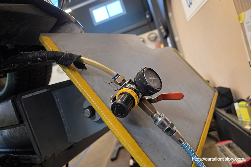 자연 낙하 방식의 배출이 끝났으면 배출구 형상에 맞게 차량을 기울인 뒤, 마일드한 세기로 에어를 불어넣어 잔유를 최대한 많이 제거합니다.