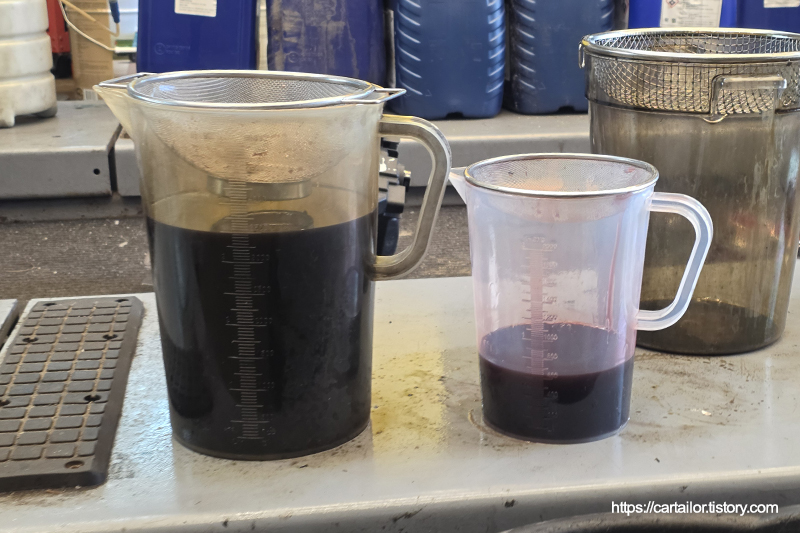 좌측부터 기존 사용유, 레벨링 시 배출된 오일 그리고 교체 후 폐기되는 소모품들입니다. 레벨링 시 배출된 오일이 현재 차량의 미션오일 상태로 보시면 되겠습니다.