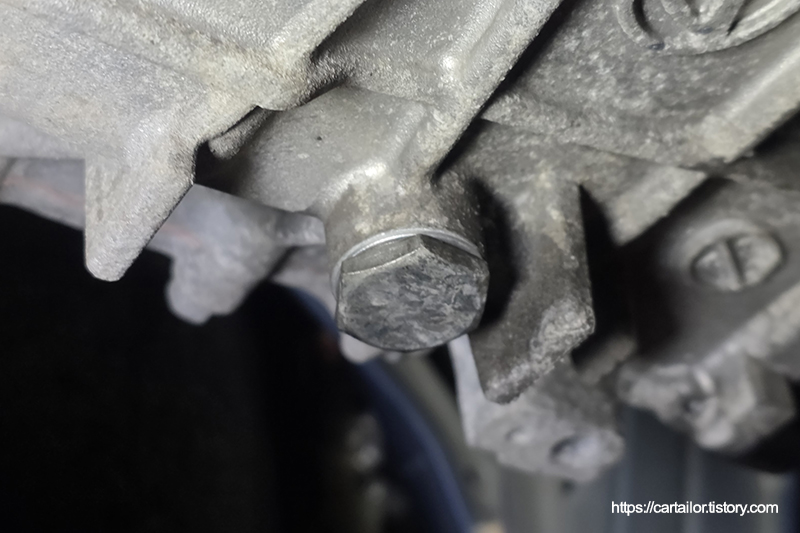 언더커버를 탈거 후, 드레인볼트를 개방해 미션오일을 배출합니다.