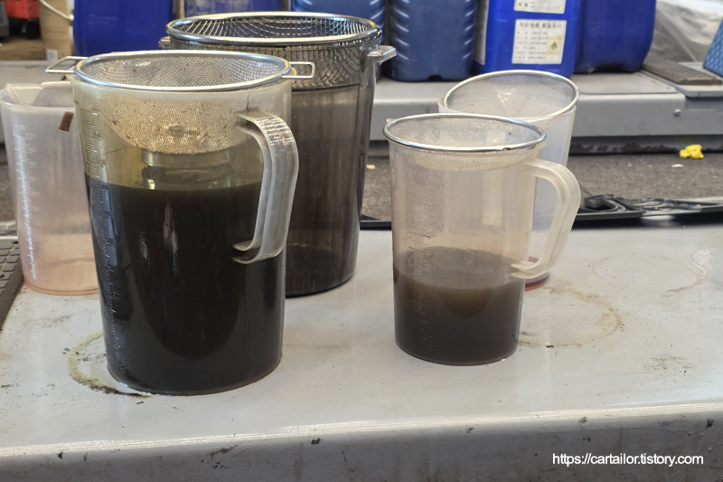 좌측은 기존 사용유, 우측은 레벨링 시 배출된 오일입니다. 우측이 현재 차량의 변속기 오일 상태로 보시면 되겠습니다.