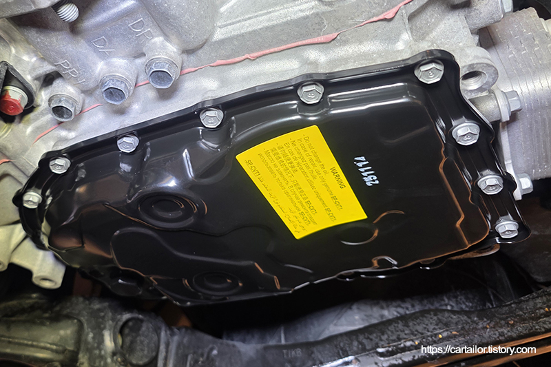 밸브바디커버를 장착 후, 신품 고정 볼트를 손으로만 돌려 오일팬 위치 조정이 가능하도록 해줍니다. 오일팬과 가스켓의 위치가 정위치가 되었으면 토크렌치를 이용해 모든 고정 볼트들을 규정 토크로 체결합니다.