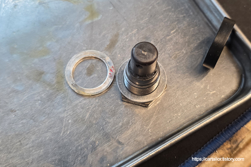 세척 및 건조가 끝난 드레인플러그에 신품 와셔를 걸어줍니다. 레벨링플러그 오링도 신품으로 준비합니다.