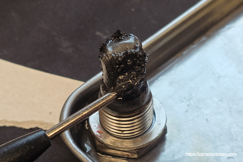 오일 배출이 완전히 끝났으면 플러그를 손으로 끝까지 돌려준 뒤, 토크렌치를 이용해 규정 토크로 체결합니다.