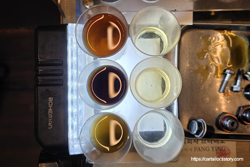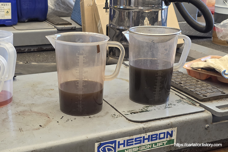 좌측은 기존 사용유, 우측은 레벨링 시 배출된 미션오일입니다. 우측이 현재 차량의 변속기 오일 상태로 보시면 되겠습니다.