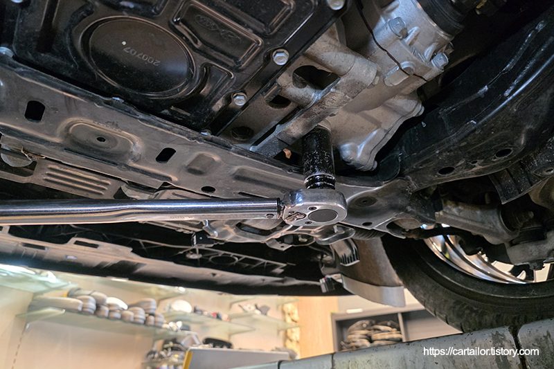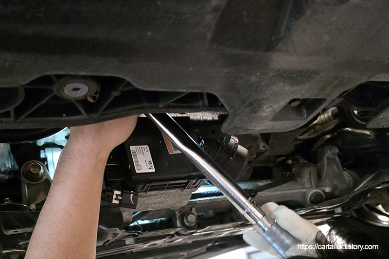 오일 배출이 완전히 끝났으면 드레인플러그를 손으로 돌려준 뒤, 토크렌치를 이용해 규정 토크로 체결합니다.