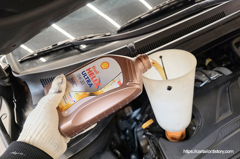 배출된 오일과 지침서에 명시된 교환 용량을 토대로 신유를 주입 후, 시동을 걸어 오일 순환 그리고 온도를 올리는 시간을 갖습니다.