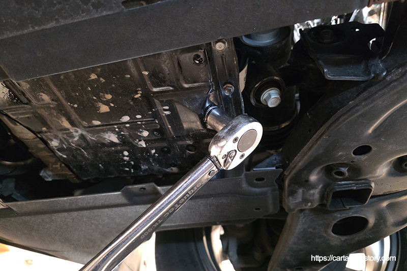 오일 배출이 끝났으면 신품 와셔로 교체한 드레인플러그를 손으로 돌려준 뒤, 토크렌치를 이용해 규정 토크로 체결합니다.