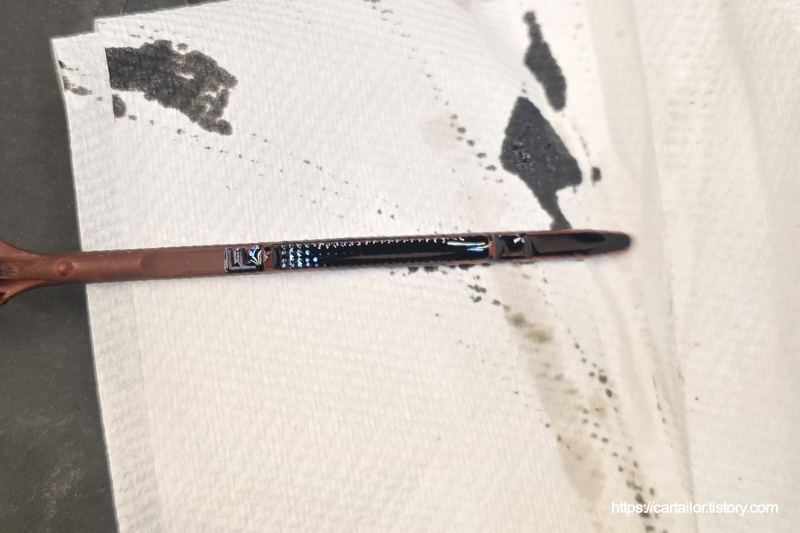시동을 끄고 수분 후, 딥스틱을 뽑아 오일 레벨을 확인합니다. 오일량이 다소 증가하긴 했으나, 주행거리를 볼 땐 양호한 편입니다.