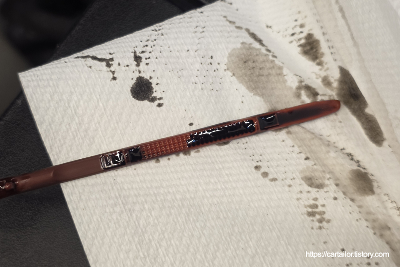 시동을 걸어 신유 순환 및 온도를 상승시킨 후, 웜업 상태에서 시동을 끄고 수분 후 딥스틱을 뽑아 레벨을 체크합니다. 의도한 세팅대로 잘 세팅되었습니다.