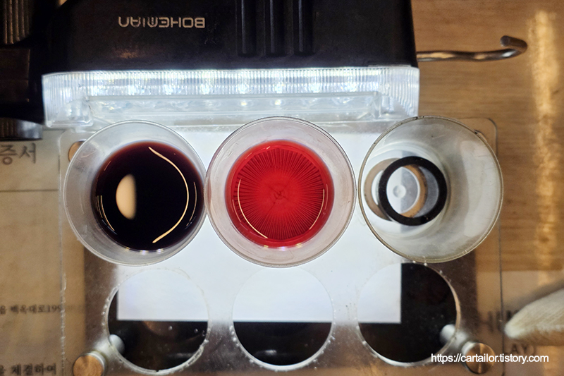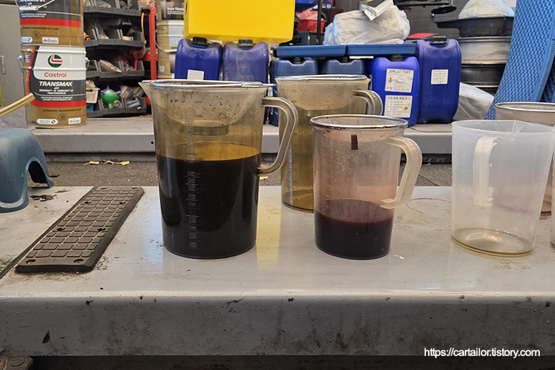 좌측부터 기존 사용유, 레벨링 시 배출된 오일 그리고 교체 후 폐기되는 소모품들입니다. 레벨링 시 배출된 오일이 현재 차량의 미션오일 상태로 보시면 되겠습니다.