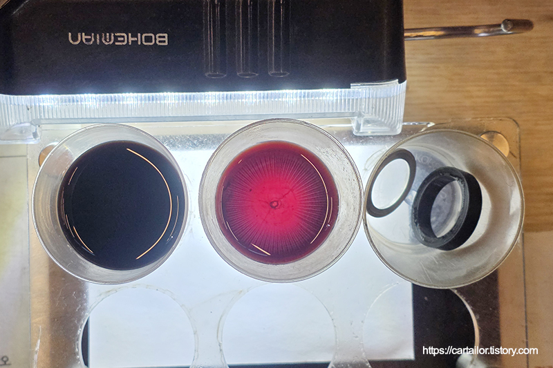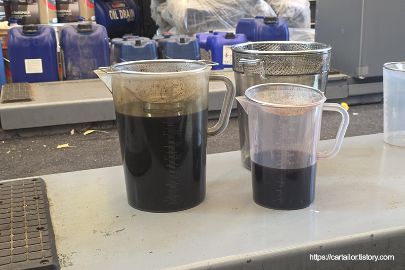 좌측부터 기존 사용유, 레벨링 시 배출된 오일 그리고 교체된 소모품들입니다. 레벨링 시 나온 미션오일이 현재 차량의 변속기 오일 상태로 보시면 되겠습니다.