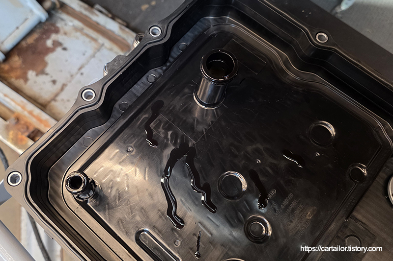 신품 오일팬과 고정 볼트입니다. 필터 일체형으로 되어 있어 일반적인 전륜 6/8단 파워텍과 비교해 필터 교체가 가능한 장점이 있습니다. 게다가 가스켓까지 모두 일체형이기 때문에 부품 수급이 편해서 좋고, 가끔 분리형 가스켓(특히 메탈재질)의 경우 배송 과정에서 변형되어 다시 신품으로 교환해야 하는 번거로움이 종종 있는데 그런 걱정도 없습니다. 신품 필터 삽입부 씰링에 신유를 발라 윤활해줍니다.