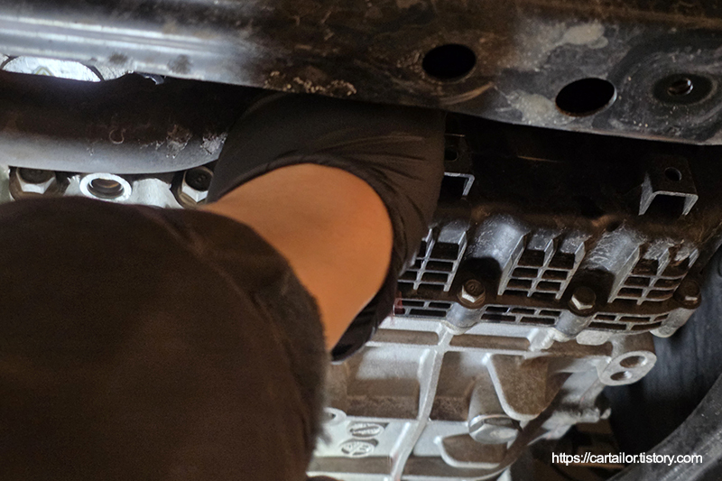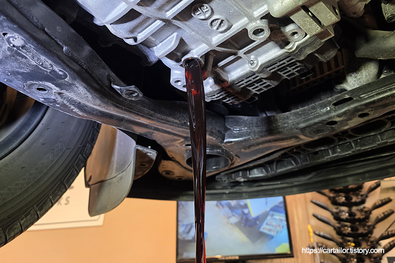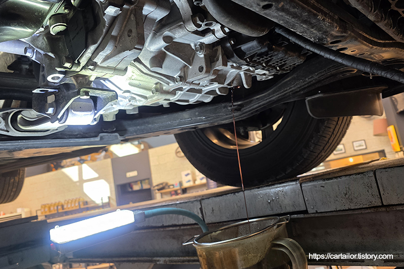 지침서에 명시된 용량의 신유 주입까지 마무리하면 변속기오일교환 과정이 종료됩니다.
