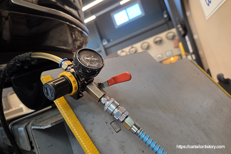자연 낙하 방식의 배출이 끝났으면 배출구 형상에 맞게 차량을 기울인 후, 입으로 부는 정도의 약한 세기로 에어를 세팅해 내부에 남아있는 잔유를 최대한 많이 배출합니다.