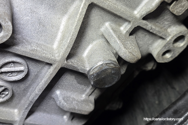레벨링플러그를 개방해 과주입된 미션오일을 배출합니다. 레벨링플러그 씰링을 신품으로 교환 후, 오일이 미량 혹은 방울 단위로 떨어지기 시작할 때 레벨링플러그를 체결합니다.