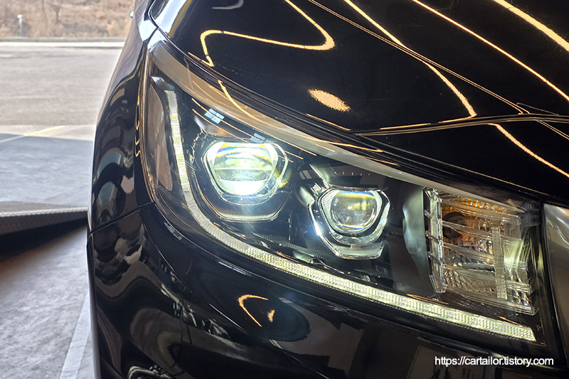 하향등과 상향등 점등 시 모습입니다. 기존 HID 사양의 경우, 하향등은 HID, 상향등은 할로겐 광원을 사용하는 타입이었는데요, LED 사양에서는 상하향등일체형인 2등식 바이펑션 타입으로 바뀌게 되어 상향등에서도 동일한 LED 광원을 사용할 수 있습니다.