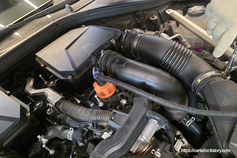 엔진오일 잔유 제거를 위해 전용 어답터와 호스를 설치합니다.