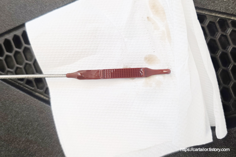시동을 끄고 15분 후, 딥스틱을 뽑아 오일 상태를 체크합니다. 상태는 양호하나, 오일이 간신히 찍힐 정도로 오일량이 부족합니다. 직전 작업자가 과소 주입을 한 건지 아니면 다른 이슈가 있어 오일량에 영향을 준 건지 알 수 없어 다음 오일교환 때 확인해보도록 합니다.