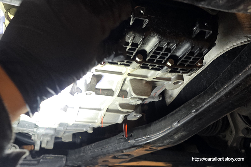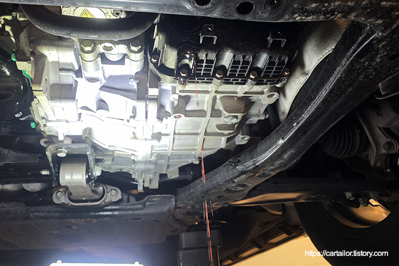 지침서에 명시된 용량의 신유 주입까지 마무리하면 변속기오일교환 과정이 종료됩니다.