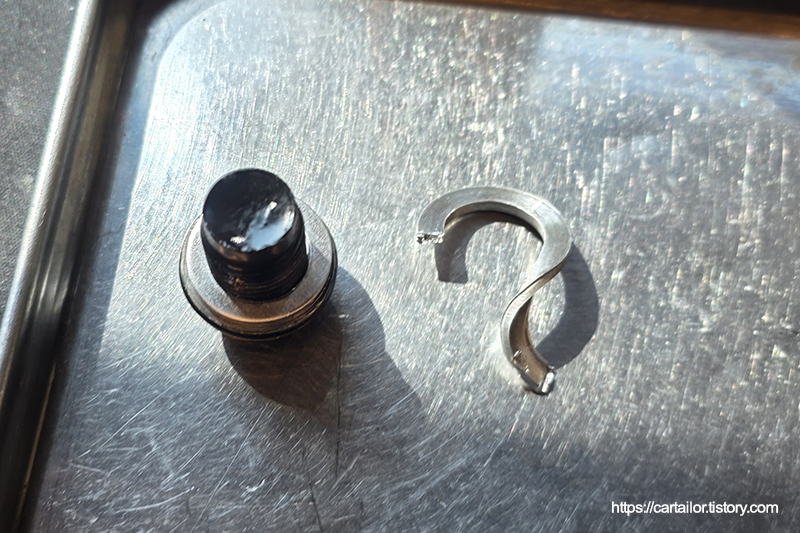 재사용의 흔적이 역력한 드레인플러그 와셔를 신품으로 교체합니다. 오일 배출이 완전히 끝났으면 플러그를 손으로 돌려준 뒤, 규정 토크로 체결해 마무리합니다.