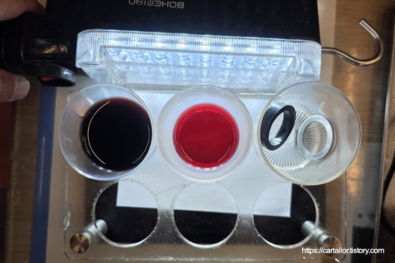 좌측부터 기존 사용유, 레벨링 시 배출된 오일 그리고 교체 후 폐기되는 소모품들입니다. 레벨링 시 배출된 오일이 현재 차량의 미션오일 상태로 보시면 되겠습니다.