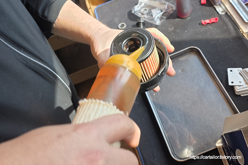 세척 및 건조를 마친 필터캡에 신품 오링, 씰링을 장착합니다. 모든 접촉면에는 신유을 발라 윤활해줍니다. 필터캡을 손으로 돌려준 뒤, 토크렌치를 이용해 규정 토크로 체결합니다.