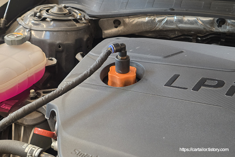 엔진오일 잔유 제거를 위해 전용 어답터와 호스를 연결한 뒤, 차량을 리프팅합니다.