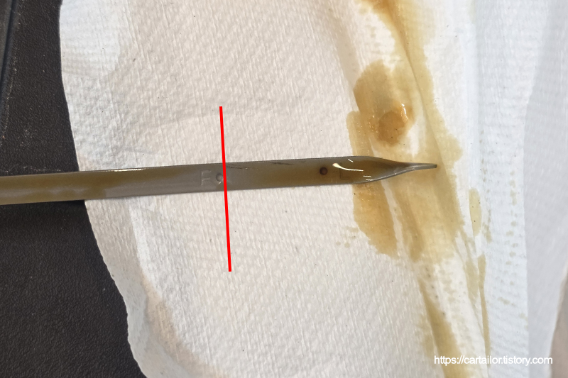 열간 상태에서 시동을 끄고 수분 후, 딥스틱을 뽑아 레벨을 체크합니다. 정량 잘 주입되었습니다.