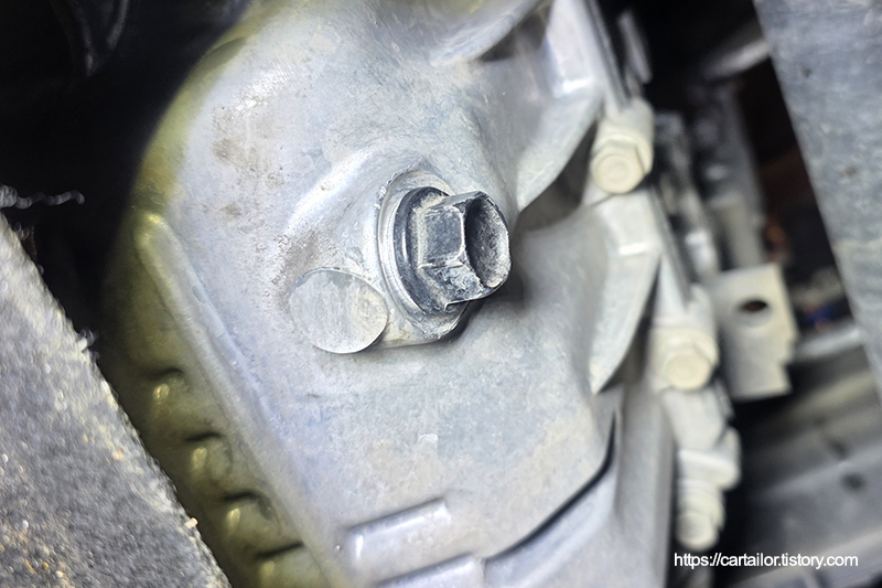 드레인플러그 와셔를 신품으로 교환합니다. 오일 배출이 완전히 끝났으면 플러그를 손으로 잠가준 후, 규정 토크로 조여줍니다.