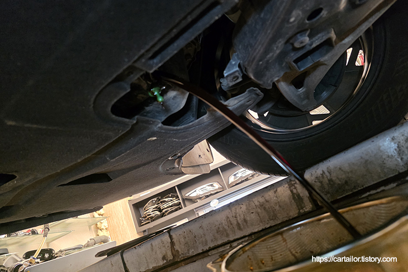 엔진오일 잔유 제거를 위해 어답터와 호스를 설치합니다.