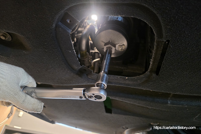 신품 오일필터 오링에 신유를 바른 뒤, 토크렌치를 이용해 규정 토크로 조여줍니다.