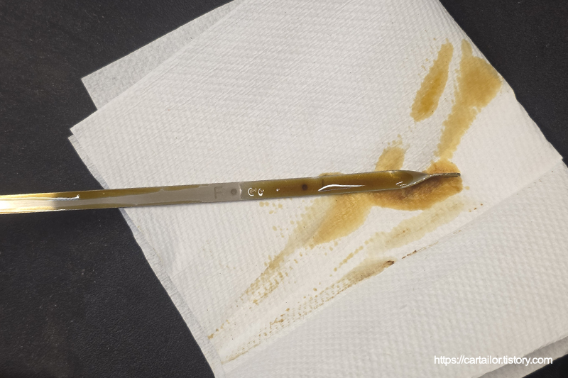 시동을 끄고 수분 후, 딥스틱을 뽑아 상태를 체크합니다. 오일 상태, 오일량 모두 양호합니다.