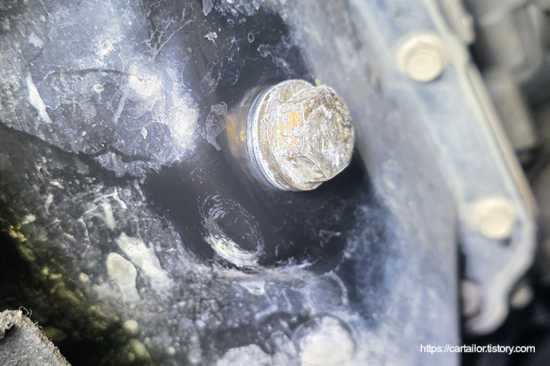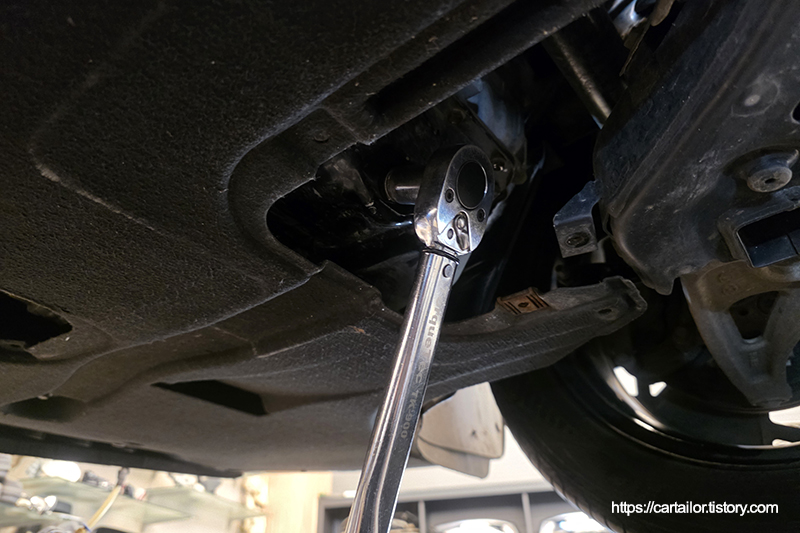 드레인플러그 와셔를 교체 후, 드레인이 완전히 끝났으면 토크렌치를 이용해 규정 토크로 드레인플러그를 체결합니다.