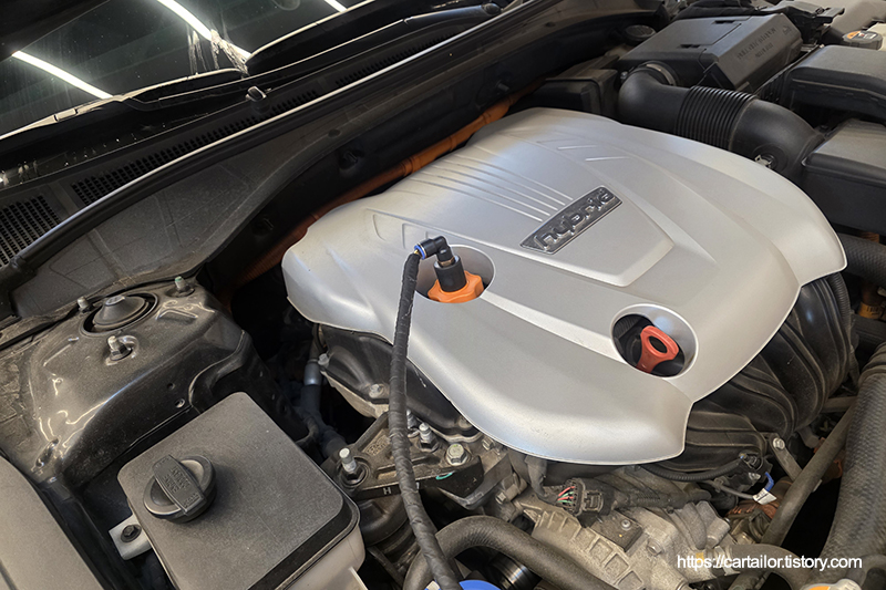 엔진오일교환 시기가 도래되어 입고된 더뉴그랜저IG 2.4 HEV 모델입니다. 현재 현대 기아 하이브리드 라인업은 1.6터보를 애용하고 있는데요, 사실 2.4리터 자연흡기도 1.6리터 대비 높은 세금을 제외하면 하이브리드와 훌륭한 궁합을 보입니다. 초기 발진 및 초저속 주행 시 전기모터로 구동되기 때문에 자연흡기 엔진의 상대적으로 부족한 저속 및 발진 토크를 완벽하게 보안해주며 터보엔진 대비 정숙하고 내구성에서도 이점이 있습니다. 다만 배기량에 따른 세금과 높은 효율 그리고 점점 무거워지는 신차에 어느 정도의 성능의 보장하기 위해서는 1.6리터 터보 엔진의 사용은 필연적일 수 밖에 없는 것 같습니다.