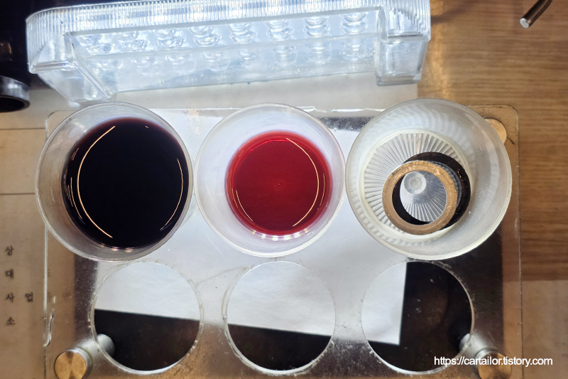 좌측부터 기존 사용유, 레벨링 시 배출된 오일 그리고 교체 후 폐기되는 소모품들입니다. 레벨링 시 배출된 오일이 현재 차량의 미션오일 상태로 보시면 되겠습니다.