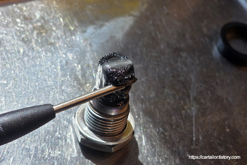 탈거된 드레인플러그의 모습으로 자성을 띄고 있어 마모에 따른 메탈성 슬러지를 포집하게 됩니다. 큰 쇳조각과 같은 이물질은 없어 특이사항은 없어보입니다.