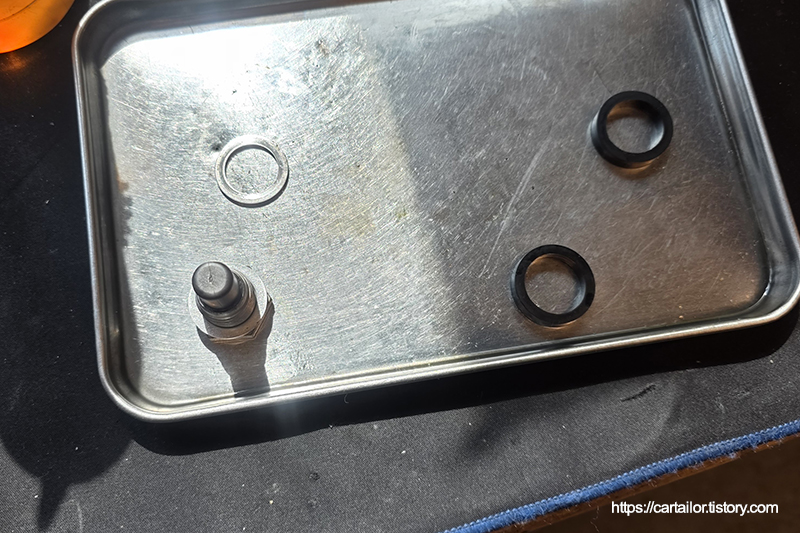 세척이 끝난 플러그에 신품 와셔를 걸어준 뒤, 레벨링플러그 오링도 함께 신품으로 준비합니다.