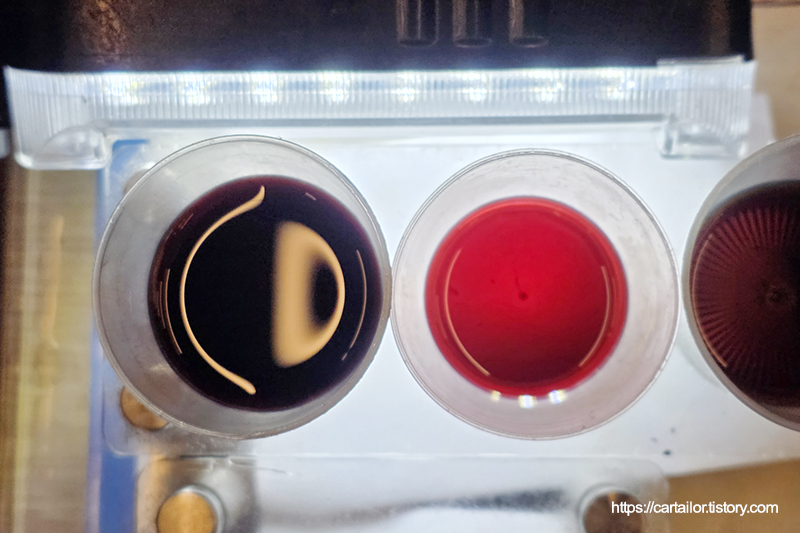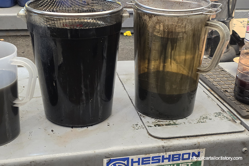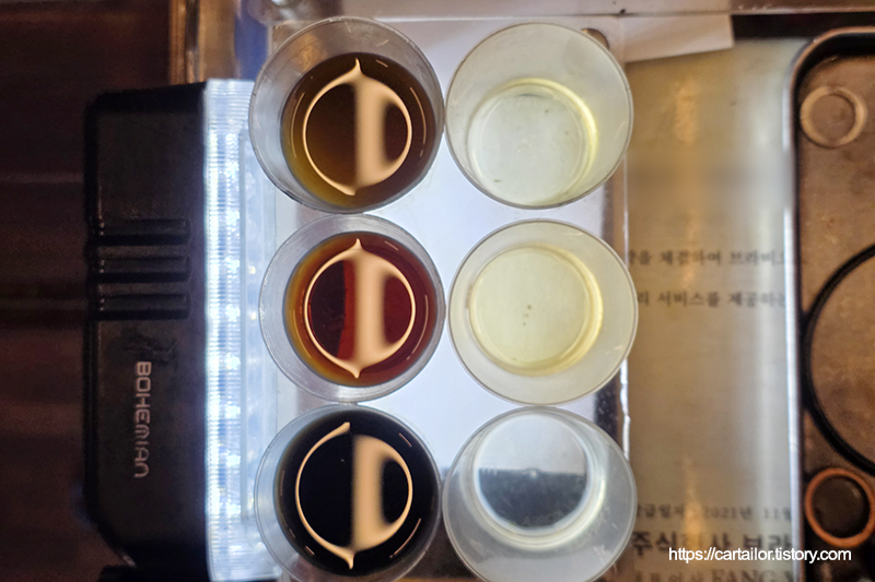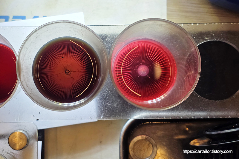 좌측부터 기존 미션오일, 레벨링 시 배출된 오일을 샘플링한 모습입니다. 우측이 현재 차량의 미션오일 상태로 보시면 되겠습니다.