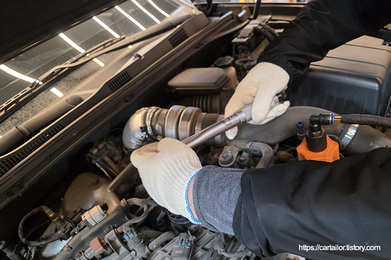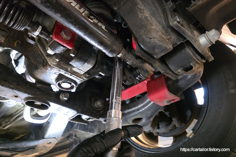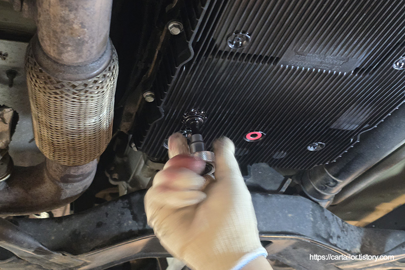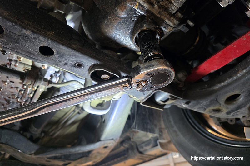 프론트와 리어 모두 오일 배출이 완전히 끝났으면 플러그를 손으로 돌려준 뒤, 토크렌치를 이용해 규정 토크로 체결합니다.