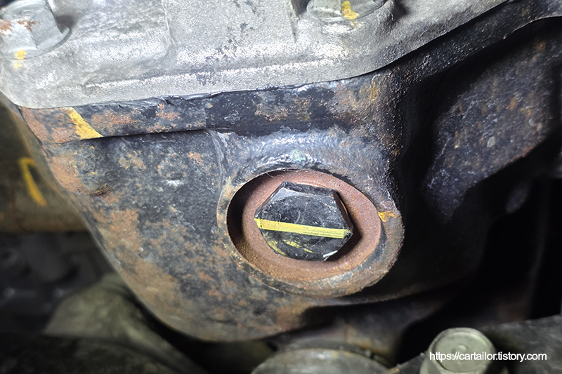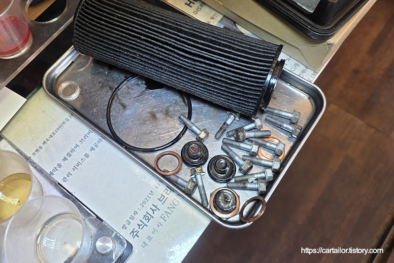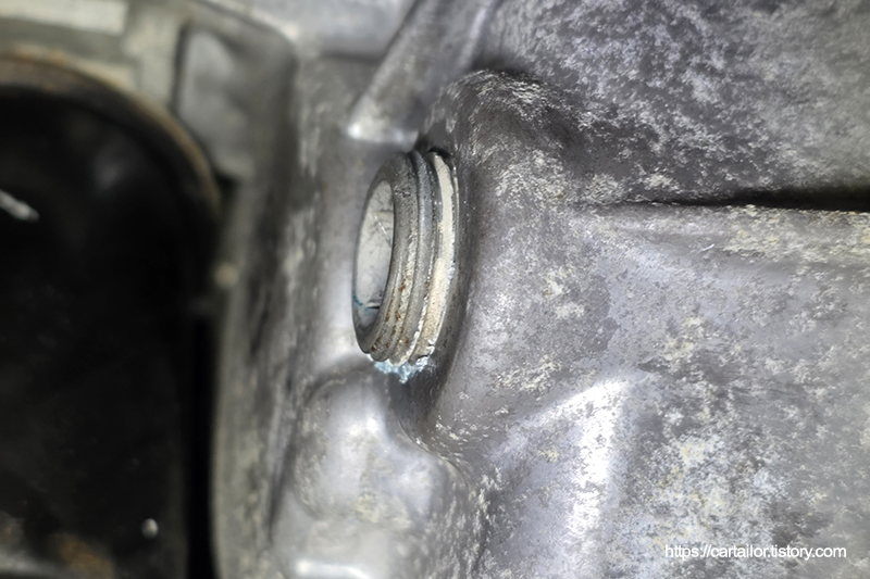 전용 세정제를 이용해 드레인과 주입구플러그들을 세척 후, 동일한 품번의 와셔들로 교체합니다.